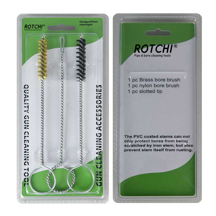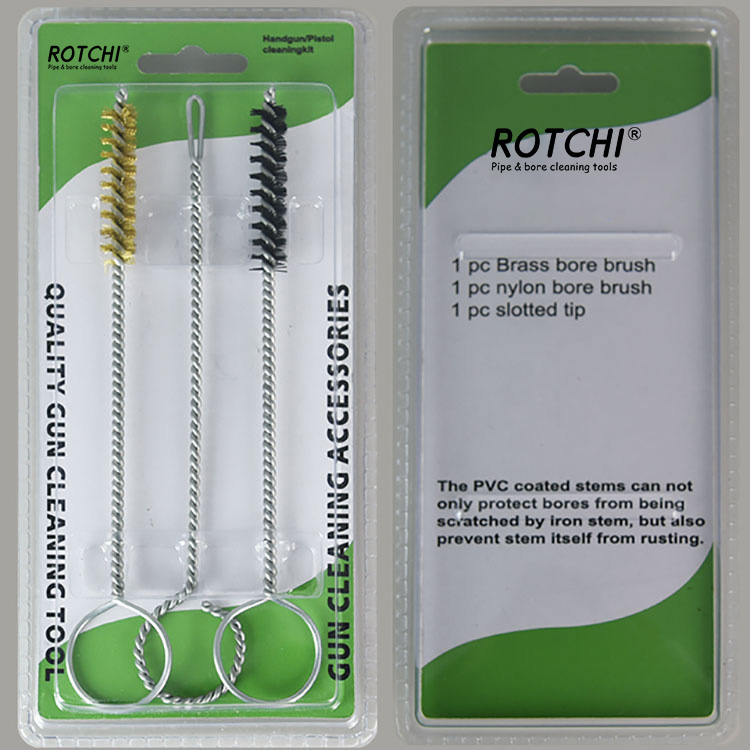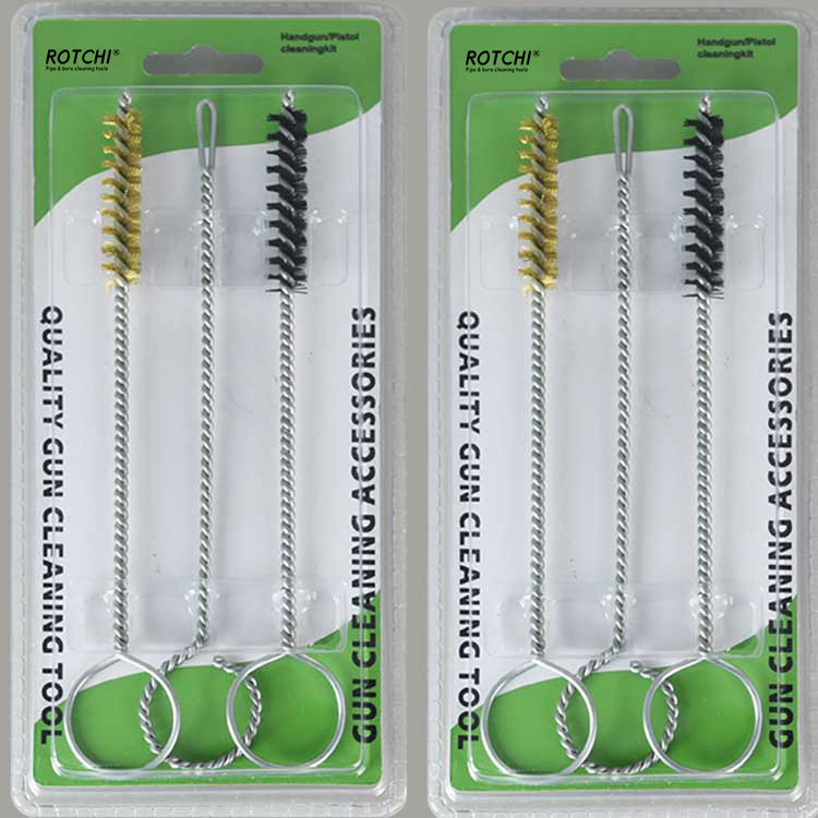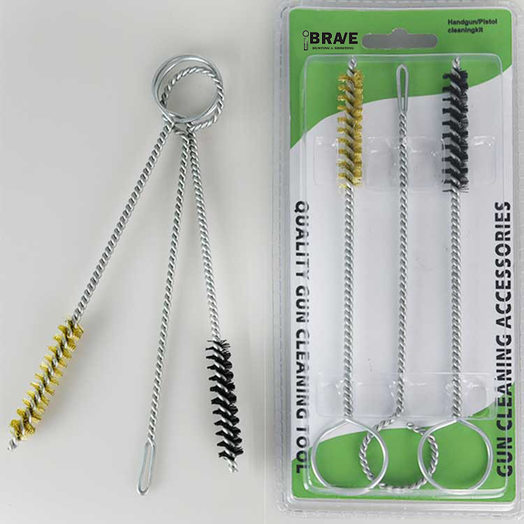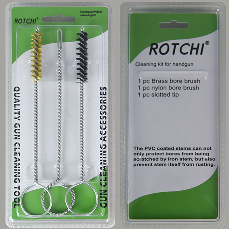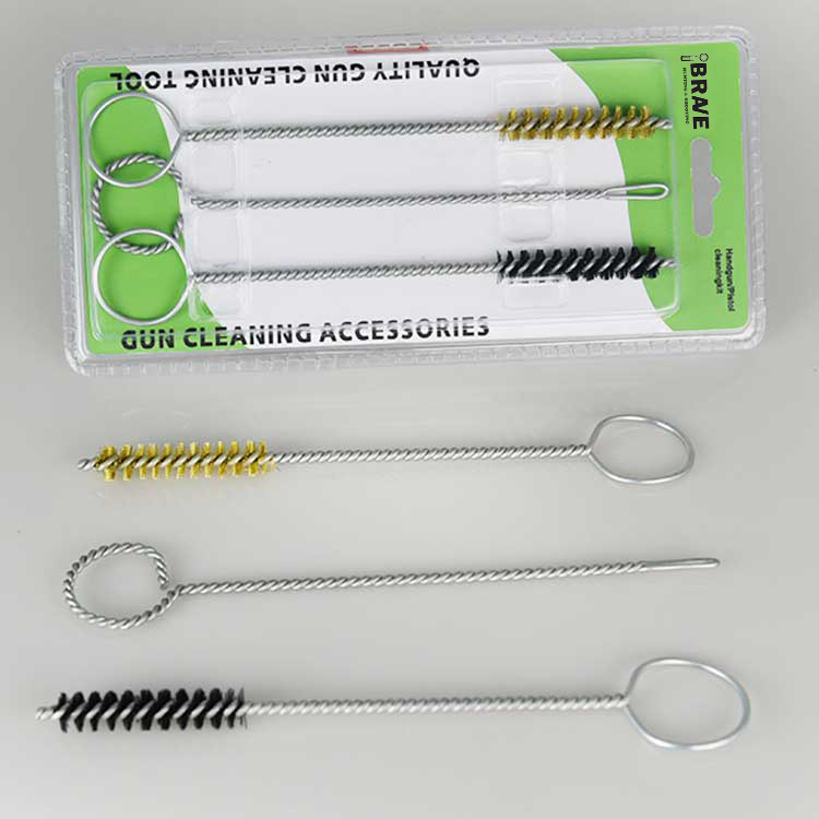 3 pcs Sethandgun Cleaing Kit, dibungkus dalam lepuh berganda. Satu tembaga menanggung berus pembersih, satu nilon mempunyai berus pembersih dan satu pemegang patch slotted. Berguna dan berkesan.