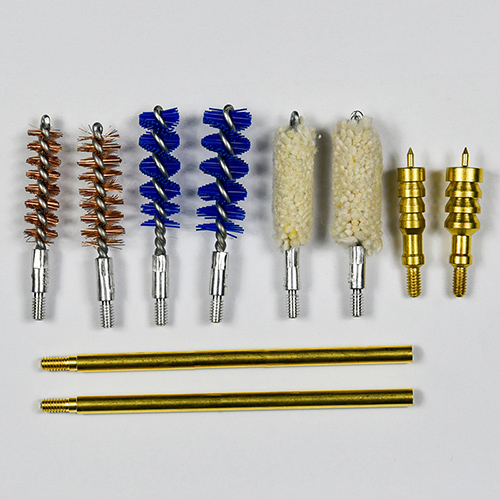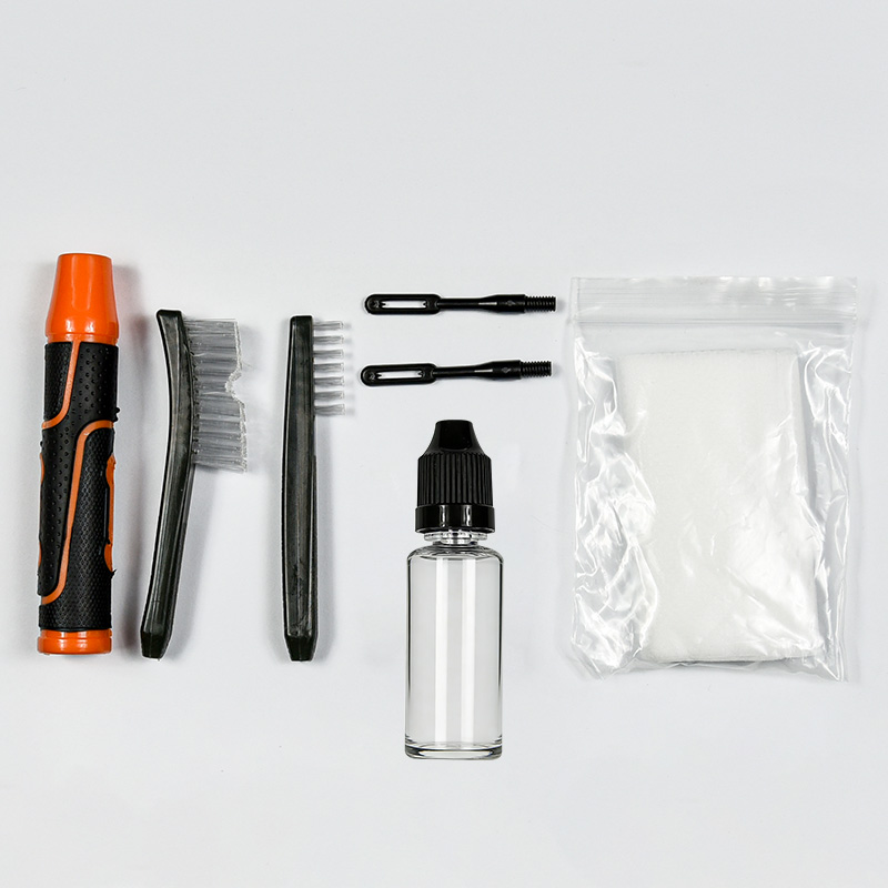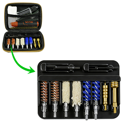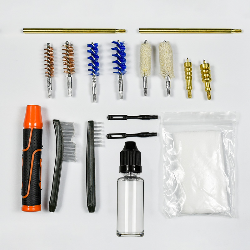 Kit pembersihan pistol termasuk 2 saiz ( 9mm & .45 kal.). bersalut kain OX Sarung PVC dengan zip. Berus tembaga, mop kapas, berus nilon, jag tembaga, 2 batang. Pasir dan warna hitam untuk pilihan.