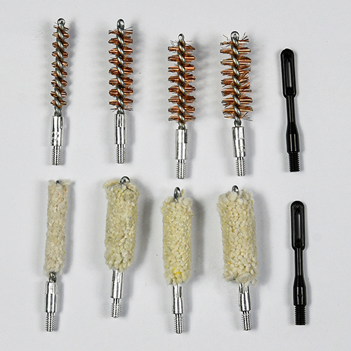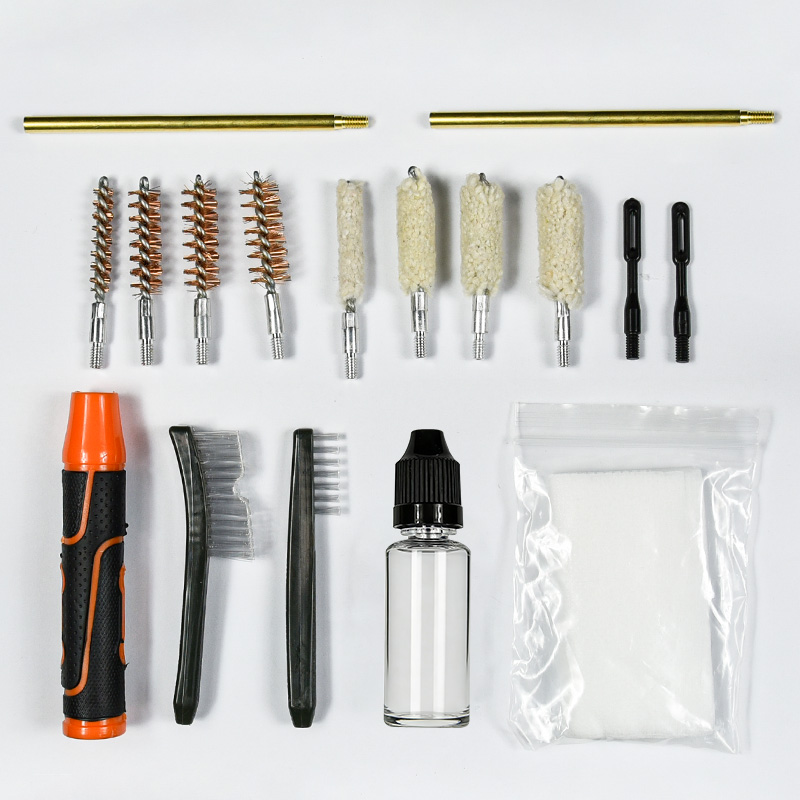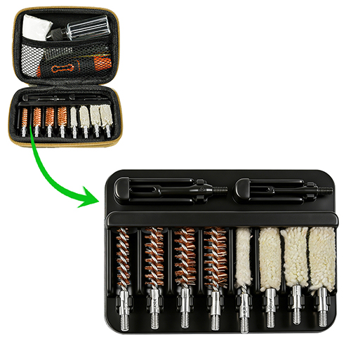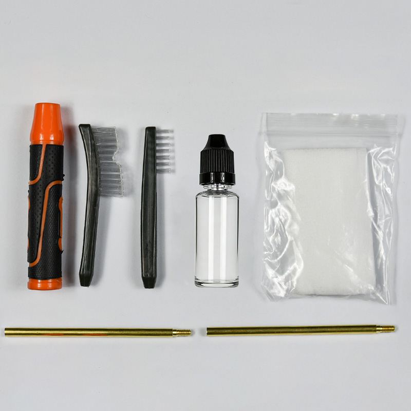 Kit pembersihan pistol termasuk 4 saiz (.22, 9mm, .40, .45cal.). bersalut kain OX Sarung PVC dengan zip. Berus tembaga dan mop kapas, 2 batang. Pasir dan hitam warna untuk pilihan.