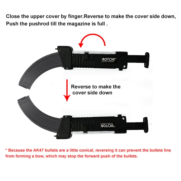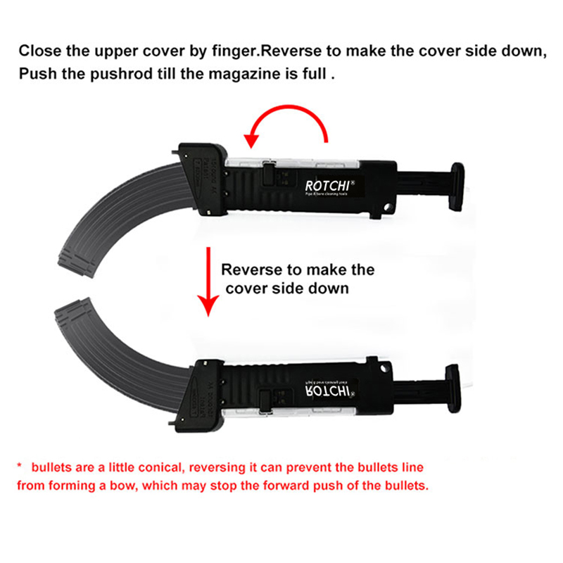 ● Digunakan untuk memuat kartrij 7.62x39mm ke dalam majalah AK dalam kapasiti 10/20/30 atau lebih besar.